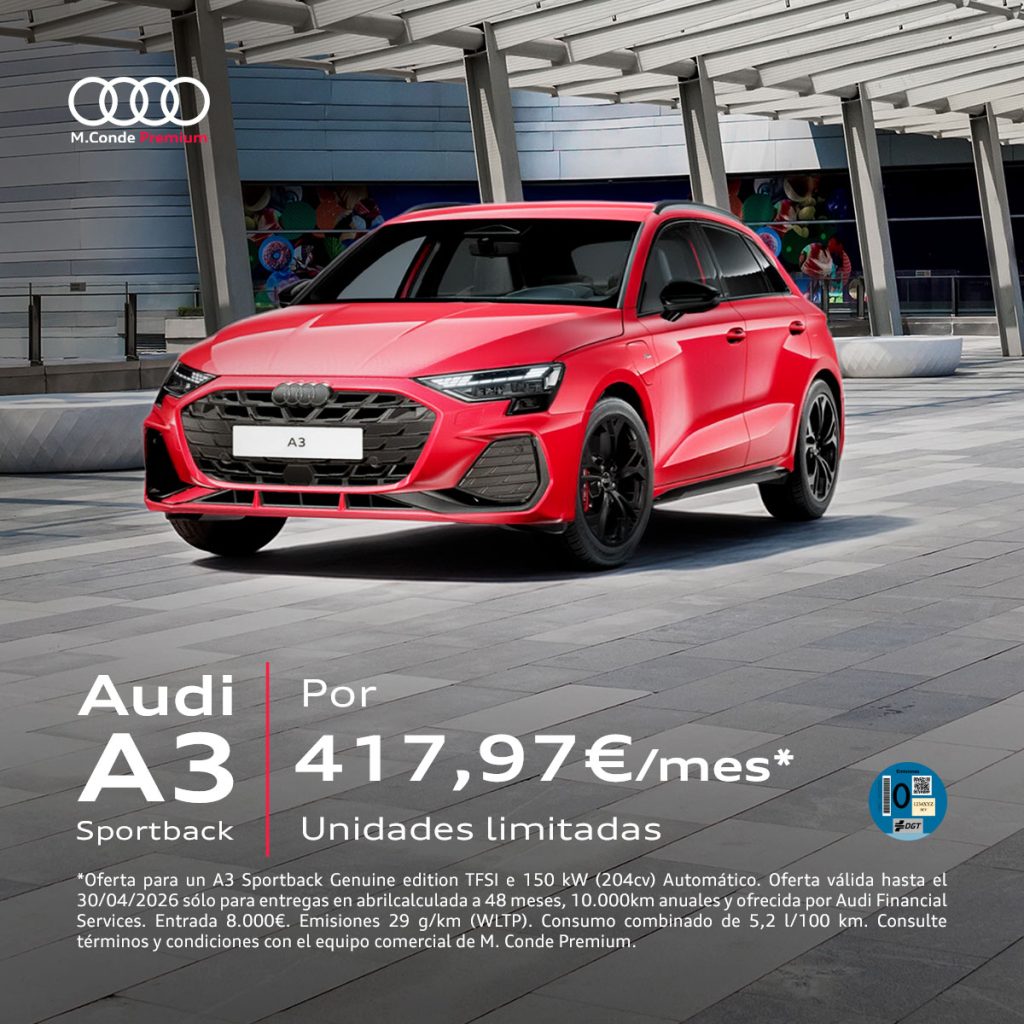 Oferta para un Audi A3 Sportback Genuine edition TFSI e 150 kW S tronic con un PVP recomendado financiando en Península y Baleares de 44.675,36 € (IVA, transporte, impuesto de matriculación, descuento de marca y concesionario y bonificación Volkswagen Bank GmbH S.E. incluidos). Oferta de financiación válida para clientes particulares que financien un crédito mínimo de 40.018,18 € con una permanencia mínima de la financiación de 48 meses a través de Volkswagen Bank GmbH S.E. (según condiciones contractuales). Ejemplo: 48 cuotas de 417,97 € y, sí lo deseas, al cabo de 4 años podrás cambiarlo por otro modelo, devolverlo o quedártelo pagando la cuota final de 31.413,71 € (calculada con 10.000 km anuales). TAE: 8,92 %. La oferta incluye los siguientes servicios opcionales y financiados que no están incluidos como gasto en el cálculo de la TAE: Audi Fulldrive Plus (48 Meses /60.000 Km) Durante48 Meses O 60.000 Km. (Lo Que Antes Suceda) por 1.250,00. Seg. Proteccion Plus Ampliado por 1.927,39.€. Entrada: 8.000,00 €. Importe total del crédito: 40.018,18 €. Comisión de apertura financiada: 1,95 % (765,43 €). TIN: 7,95 %. Importe de los intereses: 11.458,09 €. Coste total del crédito: 12.223,52 €. Importe total adeudado: 51.476,27 €. Precio total a plazos: 59.476,27 €. Precio al contado: 44.675,36 €. Precio financiado 44.075,36 €. Sistema de amortización francés. El modelo visualizado puede no corresponder exactamente con el ofertado. Oferta válida hasta fin de mes. €. Precio total a plazos: €. Precio al contado: €. Precio financiado (2) Seguros mediados por Volkswagen Insurance Services, Correduría de Seguros S.L. con CIF núm. B-28007615, www.vwfs.es/nota-legal.html. Para obtener más información relativa de los productos de seguro, consultar la documentación adjunta. Asimismo, ponemos a su disposición la siguiente dirección de correo electrónico infoseguroscliente@vwfs.com para consultas exclusivamente relacionadas con dicho/s producto/s de seguro. Esta oferta de venta tiene una validez hasta fin de mes. En el supuesto de que en el plazo indicado no se suscriba el correspondiente contrato de compraventa del vehículo objeto de la presenta oferta, ésta quedará sin efecto. El impuesto que figura en el presente documento se corresponde con el IVA vigente a fecha de hoy más el impuesto de matriculación teniendo en cuenta el valor de emisiones WLTP. La elección del valor de emisiones WLTP a efectos del impuesto de matriculación está sujeto, en todo caso al criterio oficial de las autoridades competentes en materia fiscal. Emisiones de CO2 WLTP: 29g/km Consumos WLTP: Ciclo bajo 5.7 l/100km Ciclo medio 4.5 l/100km Ciclo alto 4.5 l/100km Ciclo Extra alto 5.9 l/100km Combinado 5.2 l/100km Ponderado 1.2 l/100km. La información relativa a los consumos, las emisiones y la autonomía eléctrica ha sido determinada de conformidad con los procedimientos de medición contemplados por la normativa WLTP. El consumo, las emisiones de CO2 y la autonomía eléctrica dependen de distintos factores por lo que los valores indicados pueden variar según las condiciones reales de conducción.